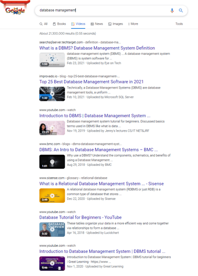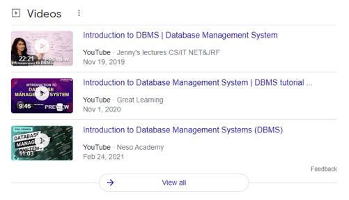 Take for example the keyword phrase “database management” which is a highly competitive, broad, non-brand keyword. The video carousel that Google currently ranks has the following videos: