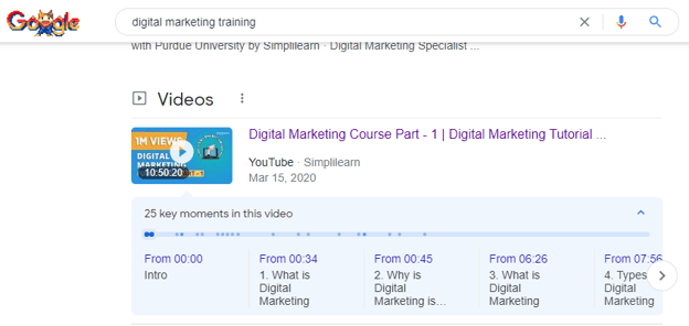 Note the reference to various “Key Moments” within each video. Key moments refer to topic areas within the video that are defined by creators who provide the timestamp information for these moments in the video description. However, Google may also infer these moments without the information being specified. You are encouraged though to define these moments explicitly in your Youtube description so as to have control over how Google segments your video content.