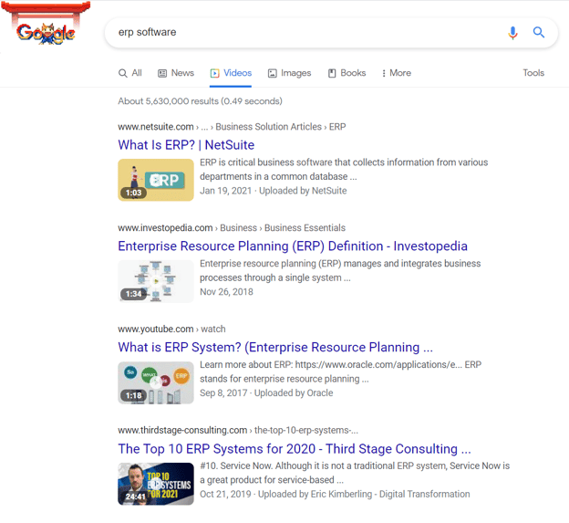 Note that the top results for “ERP software” include a YouTube video but three of the four top placements are owned by other Websites. The Google video ranking algorithm is different from the YouTube algorithm because it accounts for all videos. This means metrics like time watched, which is hugely important in the YouTube algorithm, have very limited if any effect on Google video rankings because Google doesn’t have that information for much of the video content it indexes.